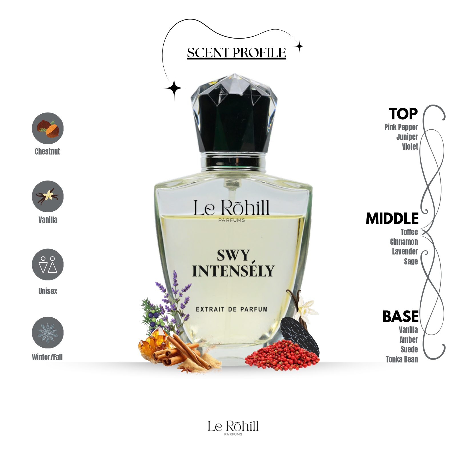 Base Notes: Vanilla, Amber, Suede, Tonka Bean