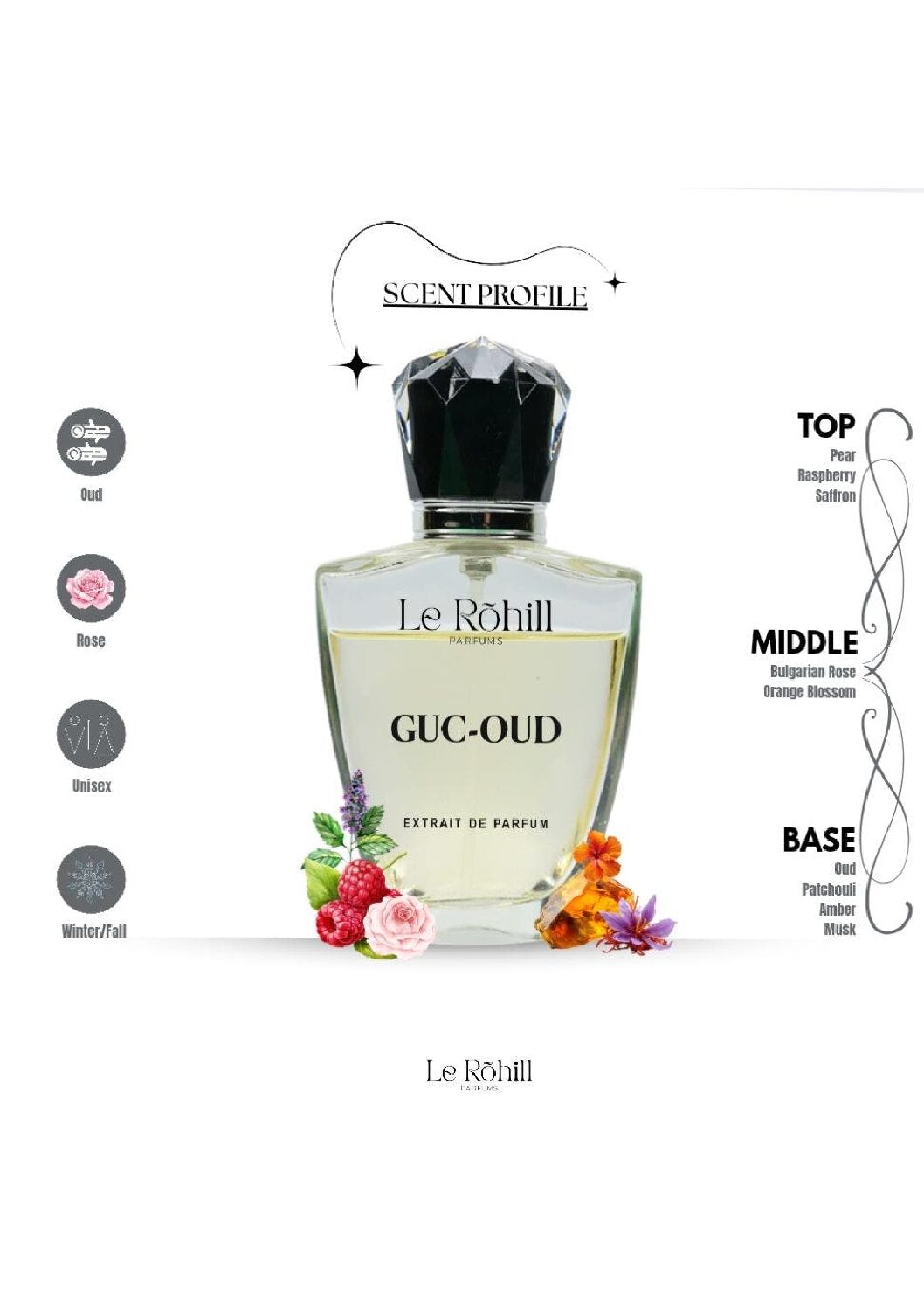 Middle Notes: Bulgarian Rose, Orange BlossomBase Notes: Oud, Patchouli, Amber, Musk