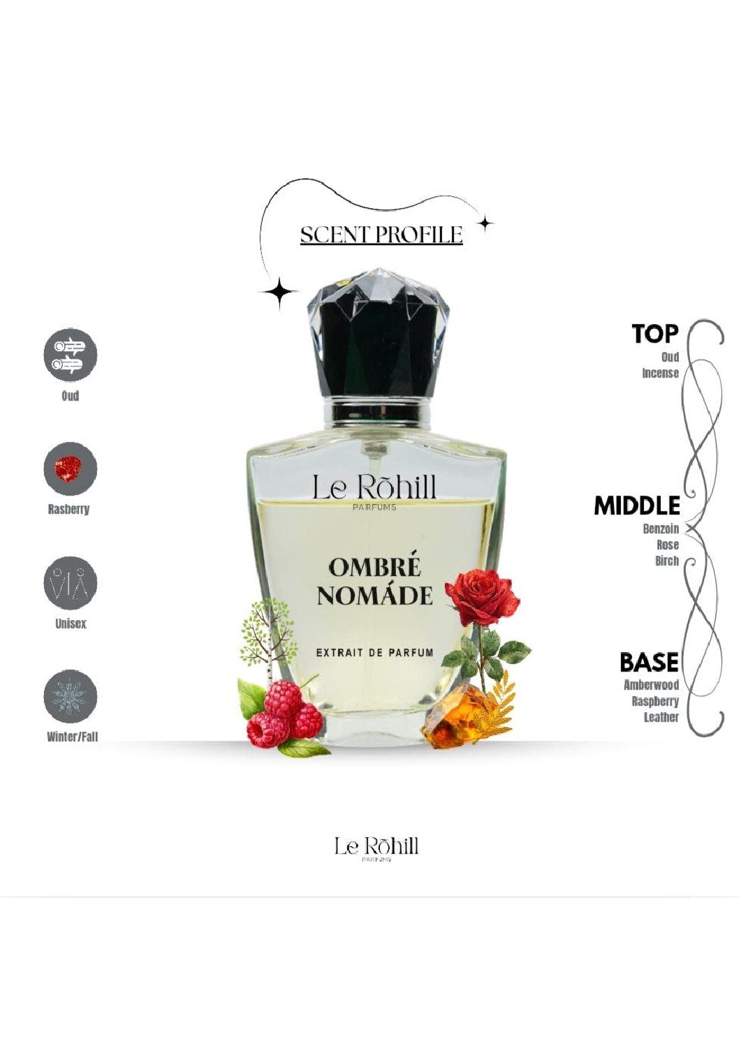 Base Notes: Amberwood, Raspberry, Leather